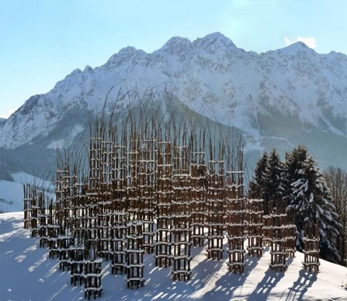 Джулиано Маури - знаменитый экологический архитектор, который, к сожалению, не дожил до наших дней. Зато его проект продолжает существовать. Он построил храм из деревьев, которые продолжают расти. В качестве материала были использованы 80 саженцев граба, 600 брусков каштана и 1800 еловых стволов. Вся конструкция занимает 650 кв.м.