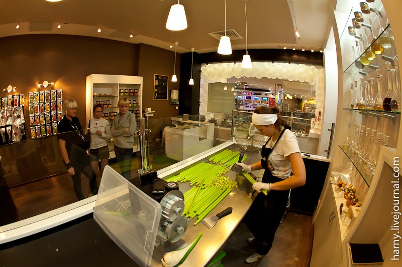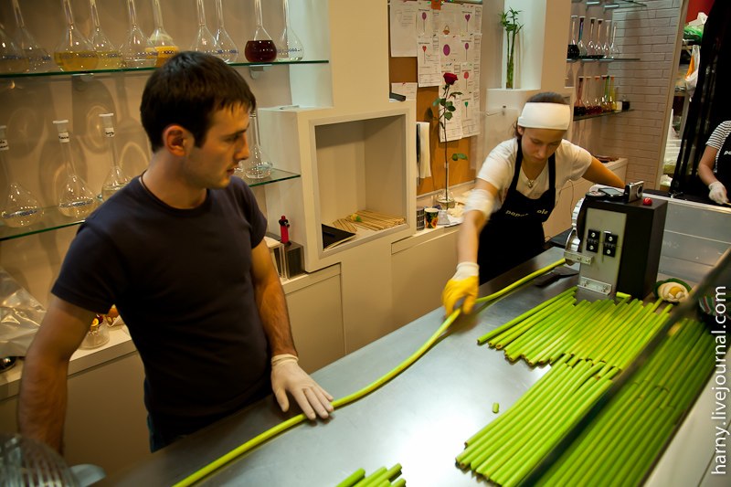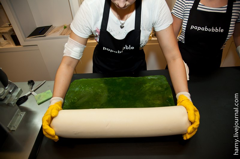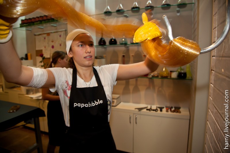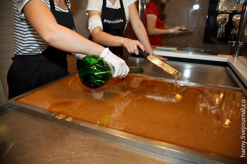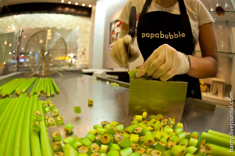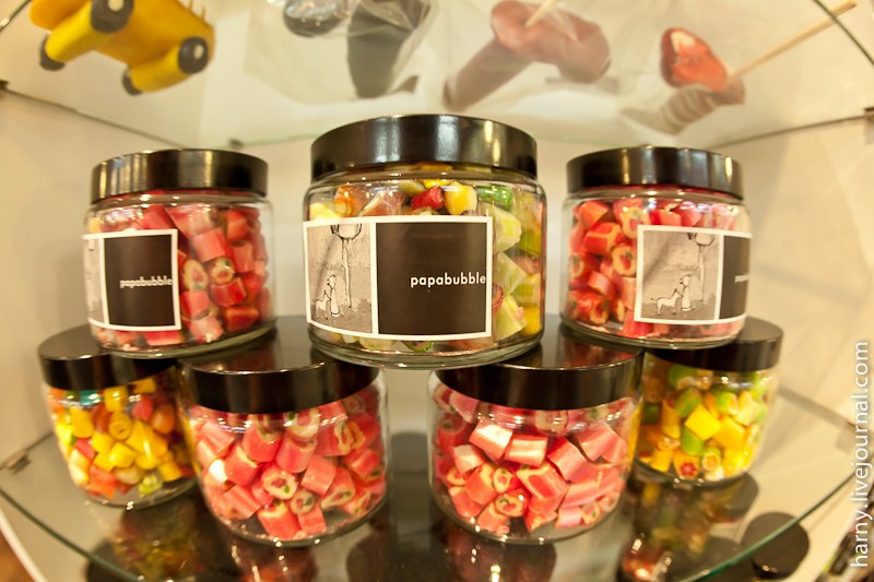 На открытие мне попасть не удалось, да и это было не лучшее время обстоятельно узнавать все подробности, слишком уж много было народа. "Papabubble" это испанский бренд и одновременно технология производства карамельных конфет разной формы, цвета и вкуса. Технология уникальна тем, что позволяет буквально на глазах создавать миниатюрные сладкие произведения искусства.