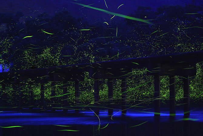 Светлячки на берегу реки Шиманто, Япония.