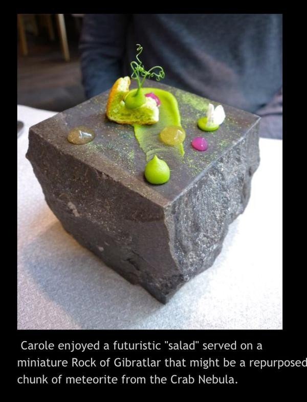 Девушка насладилась футуристическим салатом, поданным на глыбе от Гибралтарской скалы, возможно, это даже метеорит из крабовидной туманности.