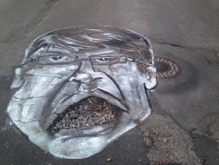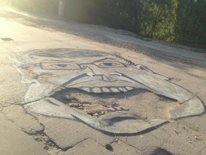Неизвестные художники использовали ямы на дороге, как части рисунка. Подобным образом жители пытаются привлечь внимание властей к проблемам дорожного покрытия.