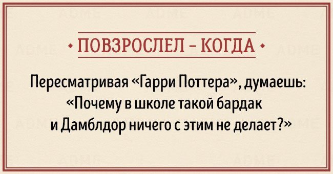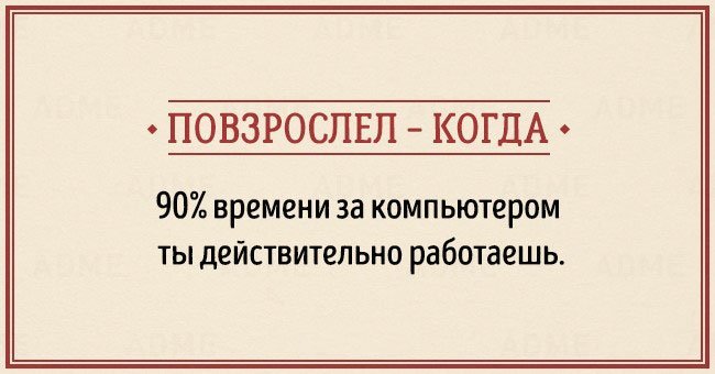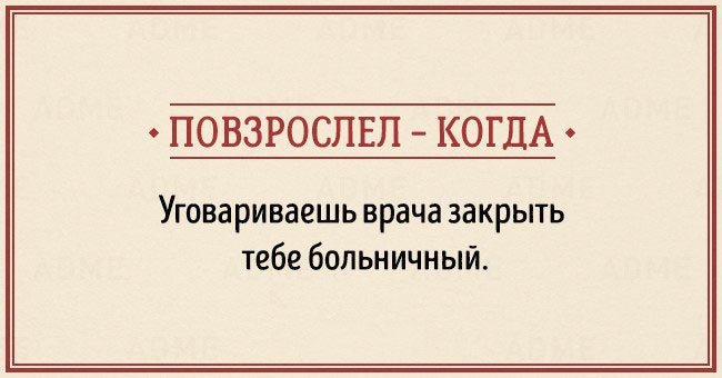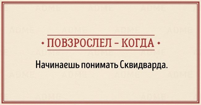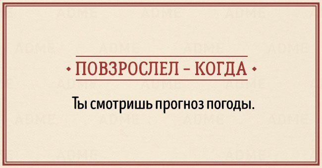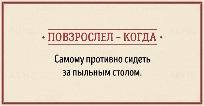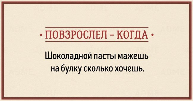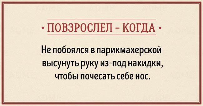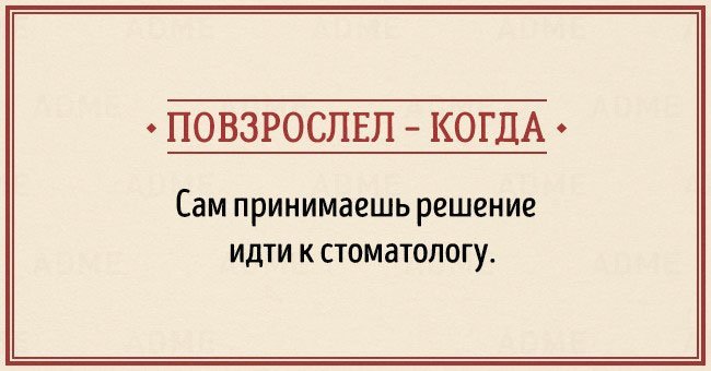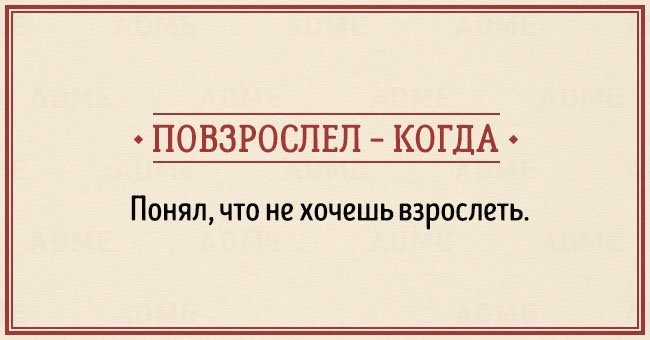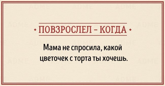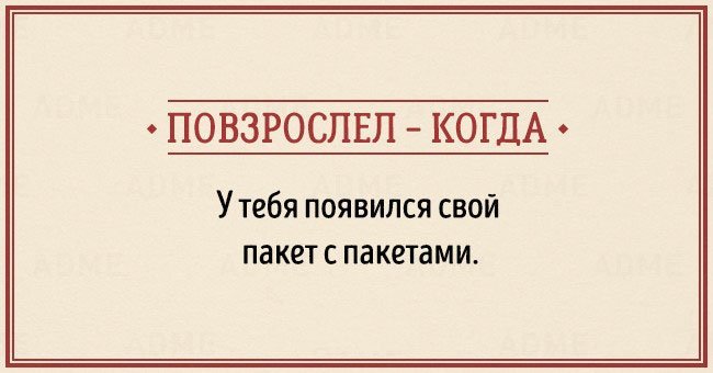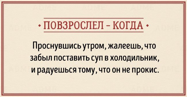 Забавные открытки о взрослении (14 фото) 12/12/2015 14:19 В жизни каждого наступает момент, когда чувствуешь, что стал совсем взрослым. И вдруг начинаешь понимать, что не существует никаких взрослых, — просто появляется больше ответственности, свободы и возможностей. Фотографии и картинки 0 Котейка 0 2 450