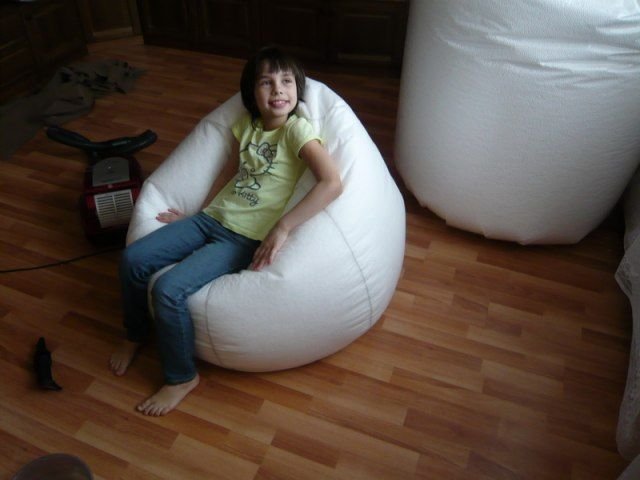 Для начала необходимо определиться, как сделать кресло мешок той формы, которая будет отвечать вашим требованиям. Дело в том, что полистирол в гранулах легко подстраивается под форму того, кто отдыхает в кресле, отлично хранит тепло, экологически чистый и не является средой обитания для различных насекомых. При желании можно вместо полистирола использовать сено, поролон или другие натуральные материалы. Однако за ними сложнее ухаживать, а из-за того, что они будут впитывать влагу, их придется менять каждые полгода. Полистирол же прослужит гораздо дольше.