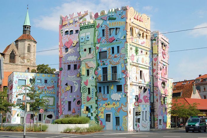 Небольшой немецкий городок не может похвастаться оригинальностью архитектуры, поэтому с помощью своего таланта художник создал разноцветные фасады с мультяшными персонажами, превратив стены в страницы детских комиксов. Теперь эти дома являются настоящими островками позитива и ярких красок!