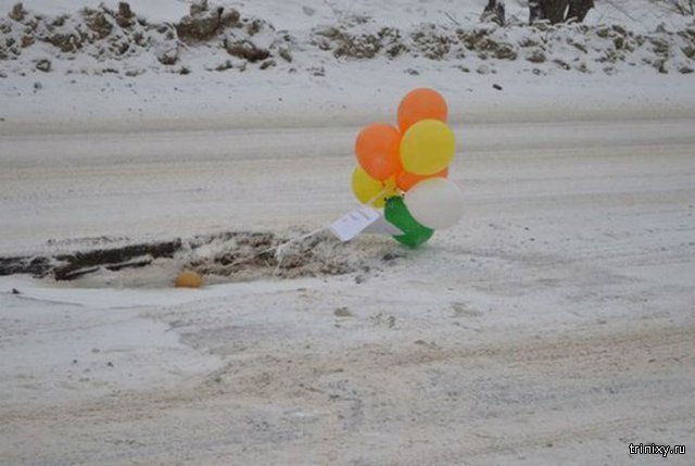 Сергей Сандркин из Ульяновска отпраздновал третий День рождения ямы на дороге у своего дома. Подобным образом парень хотел привлечь внимание властей к выбоине, которая уже долгое время не ремонтируется и затрудняет проезд. Сергей пригласил на торжество гостей, принес шары и даже праздничный торт со свечами. «Я живу рядом с этой ямой, и все эти три года очень часто прохожу мимо нее. Удивительно то, что выбоину регулярно ремонтируют, но асфальт укладывается фирменным способом – закапыванием в лужу. И каждый год одно и то же. Я снял ролик о том, как ее ремонтировали в 2013 году, но методика ремонта за это время так и не поменялась. Сначала меня все это злило, потом я стал относиться к этому с иронией: раз яму нельзя убрать, значит надо ее полюбить», - сказал Серей.