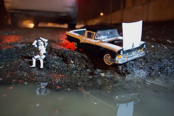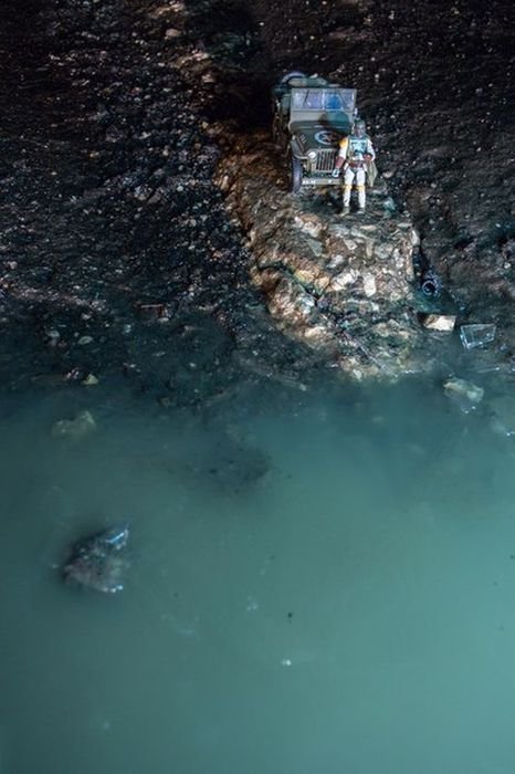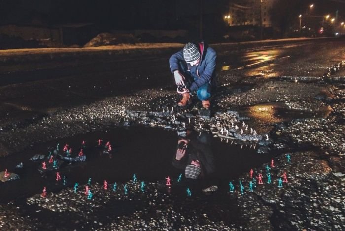 Фотографы Александр Шадрин и Григорий Ляпин решили обратить внимание властей Самары на плохие дороги в городе и превратили ямы в арт-объекты. На пересечении улиц Советской армии и Дыбенко прямо посреди дороги они устроили инсталляцию, частью которой стали и ямы в асфальте. Вокруг заполненных водой ям расположились фигурки солдатиков и игрушечные автомобили, в итоге получилось некое подобие водоема, у которого идет бой.