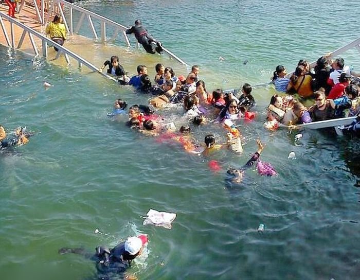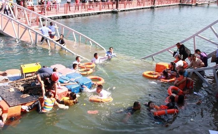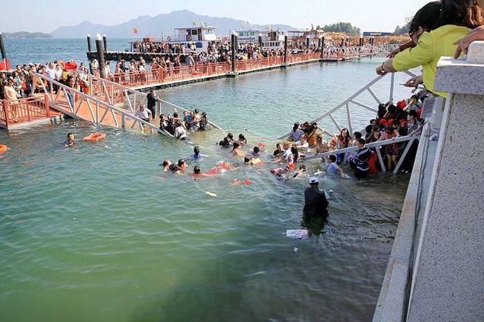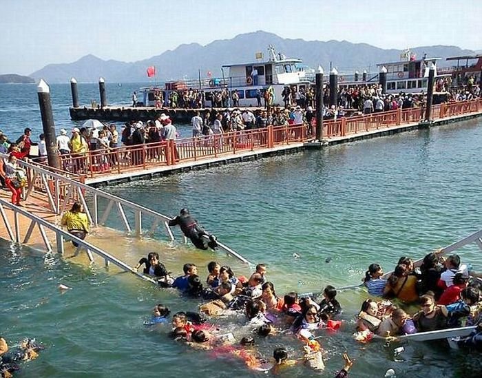 Шокированные туристы были спасены прохожими, когда мост, по которому они проходили, рухнул и они упали в воду. Мост в Желтом море около живописного места горы Лушань Цзюцзян в городе Китая, был недавно построен и до сих пор находился в пробном использовании. Но туристы проигнорировали предупреждения от управленческого персонала, который советовал им проходить по мосту небольшими партиями.