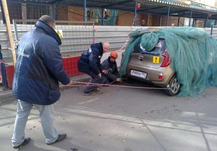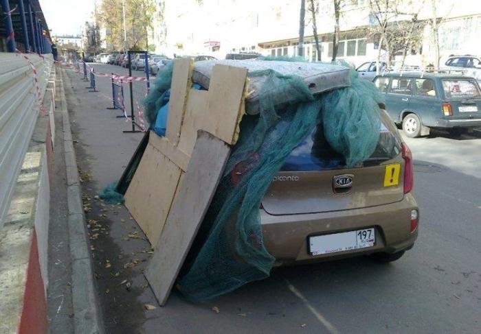 Некоторые водители, в частности женского пола, считают, что дорожные знаки - не для них. Одна ТП решила припарковать свой автомобиль рядом с площадкой, где проводился снос здания, несмотря на предупреждения прораба. Надежды на то, что хозяйка скоро вернется, не было, поэтому мужики решили защитить авто от возможных повреждений. Девушке стоит как следует отблагодарить строителей за доброту. На их месте я бы просто плюнул.