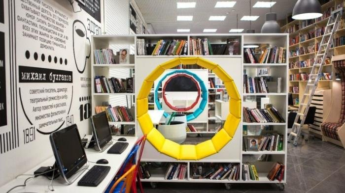 Просторные светлые помещения, продуманные сочетания цвета и освещения, необычный дизайн обстановки, встречающий посетителя сразу за порогом, присущ скорее знаменитым корпорациям Google и Apple, нежели обычной районной библиотеке.