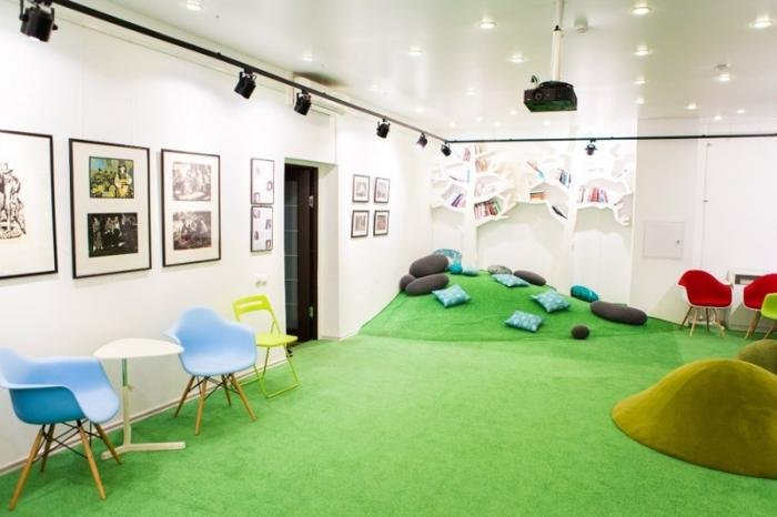 Разрыв шаблонов происходит сразу же, гость видит типичных пожилых библиотекарш, увлеченно работающих на мощных современных компьютерах, во всех залах модерновая мебель, здесь же, в библиотеке имени Гоголя, можно, выбрав любимую книгу, совершенно свободно улечься на зеленых холмах арт-холла и погрузиться в удивительную реальность книги.
