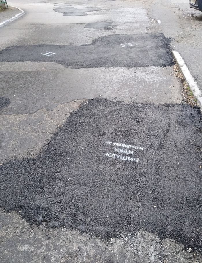 В Челябинске накануне местных выборов в районные депутаты один из кандидатов — некий Иван Клушин — решил, как это водится, сделать малость добра. Именно малость — Иван залатал несколько дырок в асфальте. И дабы его подвиг был замечен и не дай бог не приписан другому кандидату, Клушин подписал каждую заплатку с помощью трафарета.