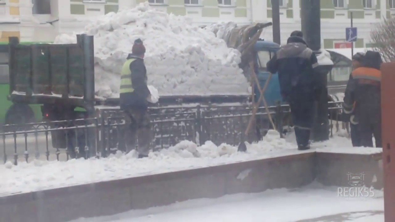 Омские коммунальщики разбрасывают снег из машины по улице