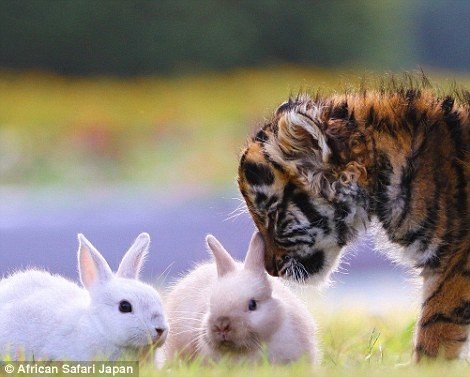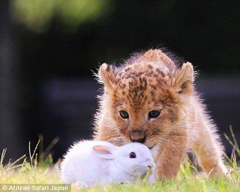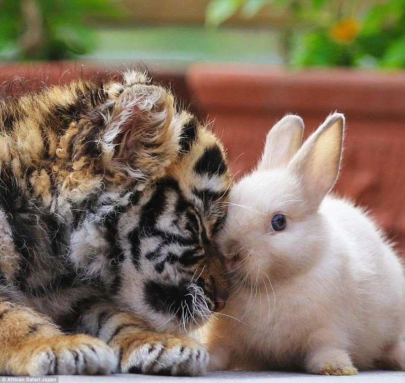 Они вместе гуляют, вместе играют, засыпают в обнимку друг с другом и совсем не замечают различий между собой. Пока хищнические инстинкты у них не развились, они обнимаются даже с кроликами!