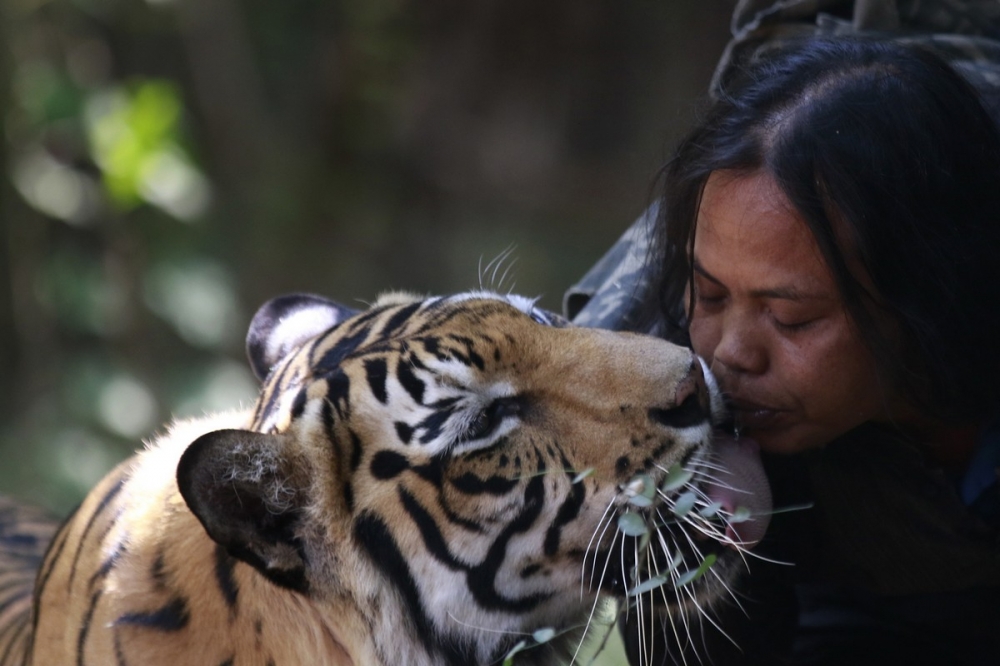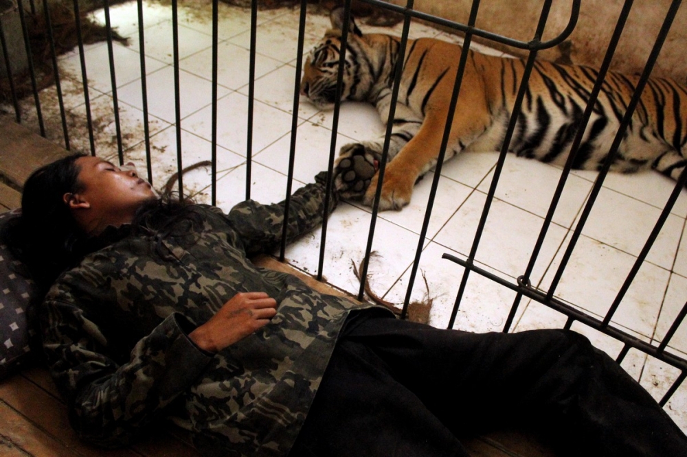 36-летняя Abdullah Saleh 10 лет держит в качестве домашнего питомца самку бенгальского тигра во дворе своего дома в Маланге, Восточная Ява, Индонезия. Тигренок по кличке Mulan Jamila появился в семье в трехмесячном возрасте и с тех пор у них сформировалась удивительная дружба. Каждый день учительница играет с тигрицей, не боясь обниматься, дразнить и даже целовать трехметрового зверя, который ест по 10 кг куриного или козьего мяса в день. Женщина рассказала, что иногда спит рядом с вольером тигрицы. Также она призналась, что после игр с любимым питомцем, на теле иногда остаются раны и царапины.