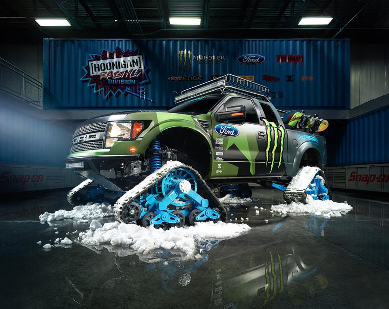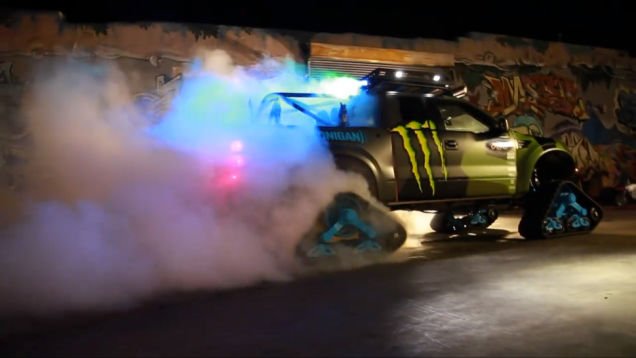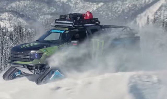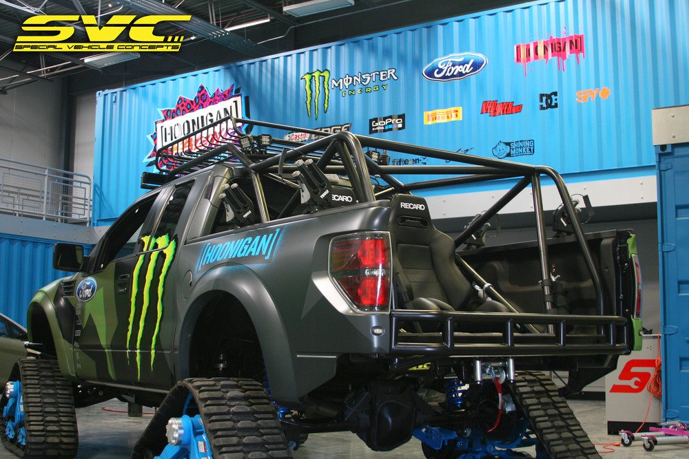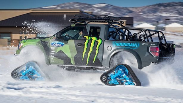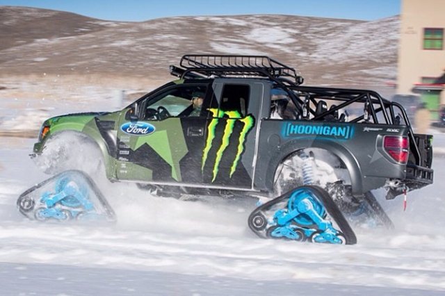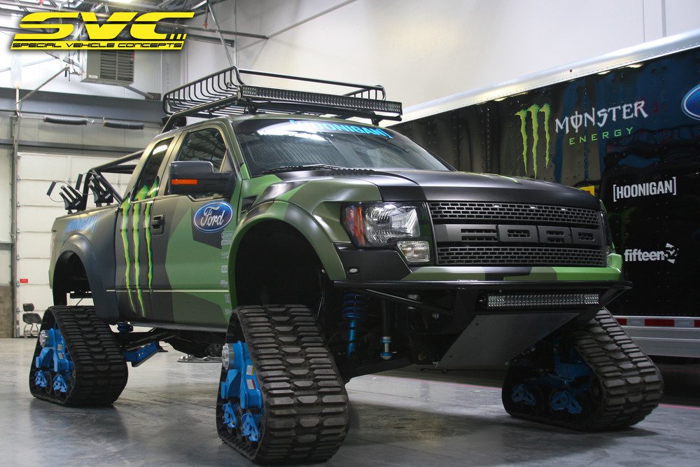 Известный раллийный гонщик, экстремал и бизнесмен Кен Блок решил, что обычный Ford F-150 SVT Raptor недостаточно хорош в условиях снежного покрова. Поэтому он заменил колёса внедорожника траками Mattracks, назвав своё творение RaptorTRAX. Монструозный снегоход также укомплектован задней лебёдкой, внешней звуковой системой и мощным освещением от Rigid Industries. Его созданием занимались в калифорнийской студии Special Vehicle Concepts.