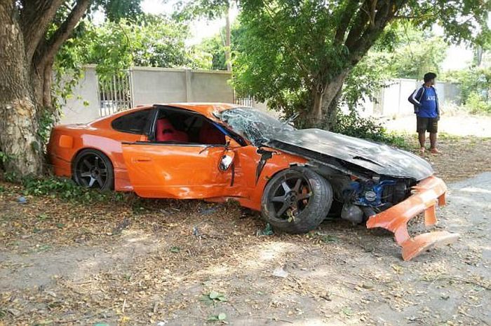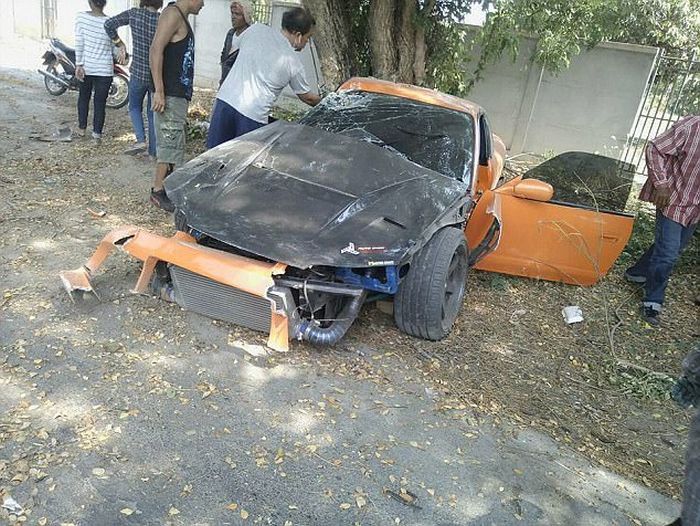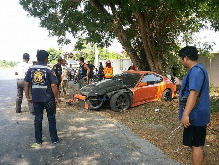 Попытка 31-летнего буддийского монаха прокатиться на спорткаре Nissan Silvia S15 своего друга закончилась неудачно: едва выехав за ворота храма в Таиланде, он влупился в дерево. Результат: авто в хлам, у монаха сломана рука и порезана нога, а его друг потерял сознание.