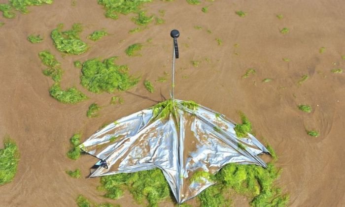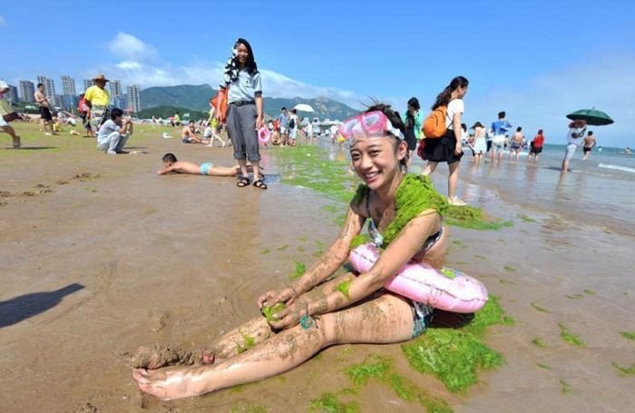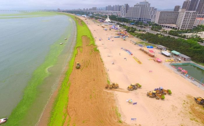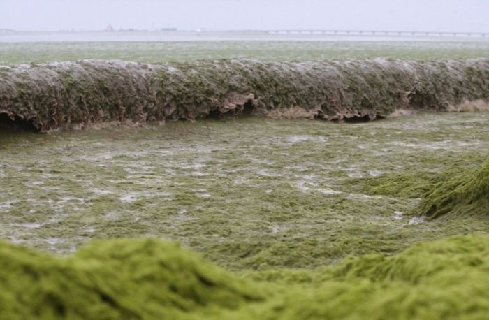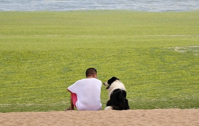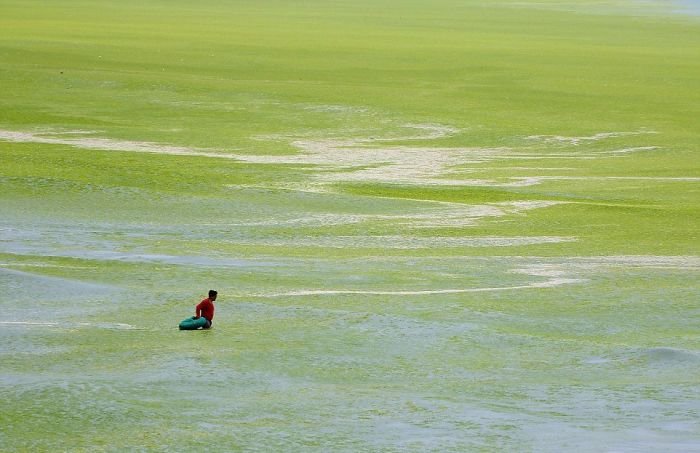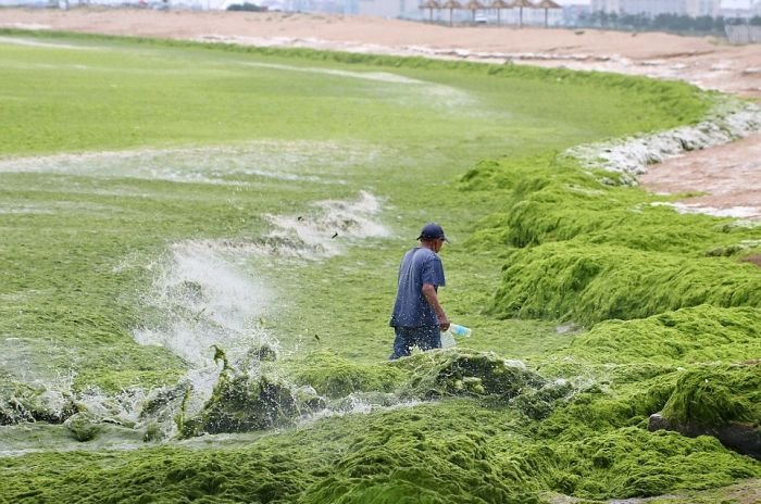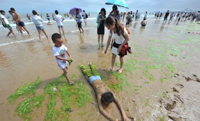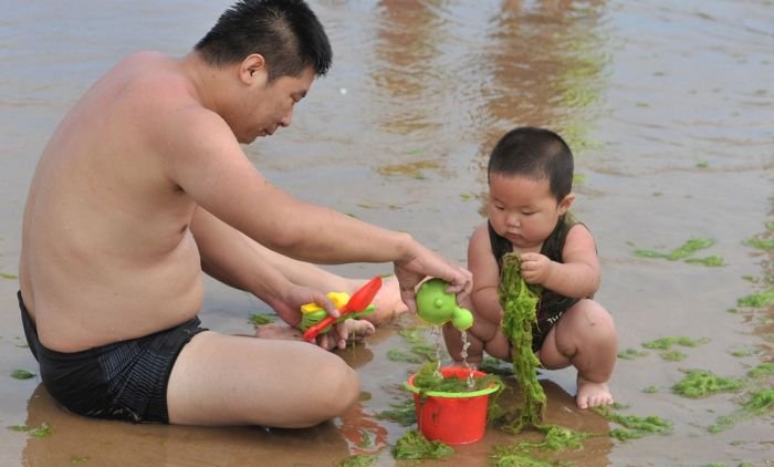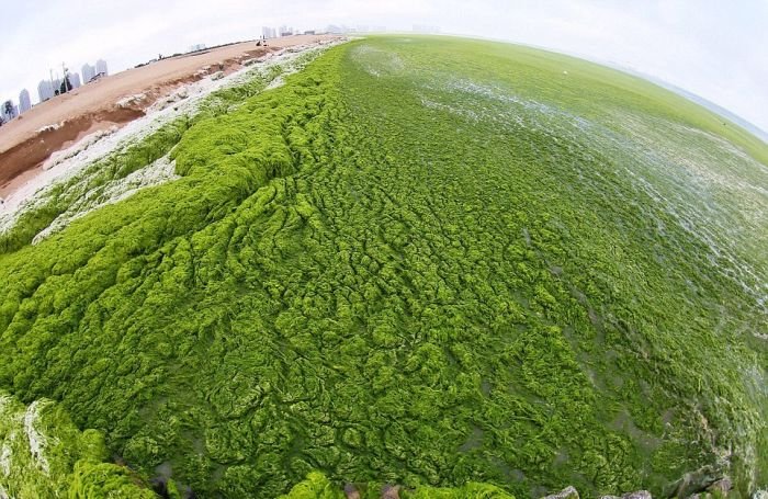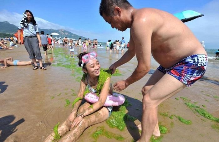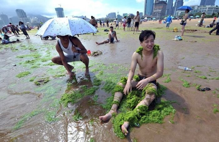 Несмотря на сезон цветения водорослей пляж китайского города Циндао по-прежнему остается весьма оживленным и многолюдным местом города. Люди с радостью купаются в зеленой жиже и защищают кожу от ожогов с помощью морских растений. Для человека эти водоросли совершенно безопасны, а вот животные находятся в опасности, так как водоросли активно поглощают из воды кислород.