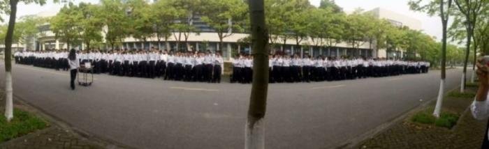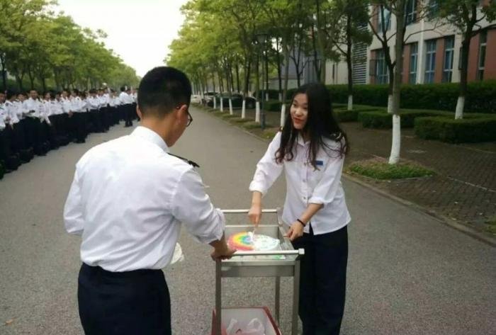 В Шанхайском колледже специальность морского инженера получает лишь одна девушка по имени Ву Синь. И 280 мужиков. Сокурсники решили устроить девушке достойный день рождения и начали поздравлять уже на построении. Интересно, как тортик делить будут?