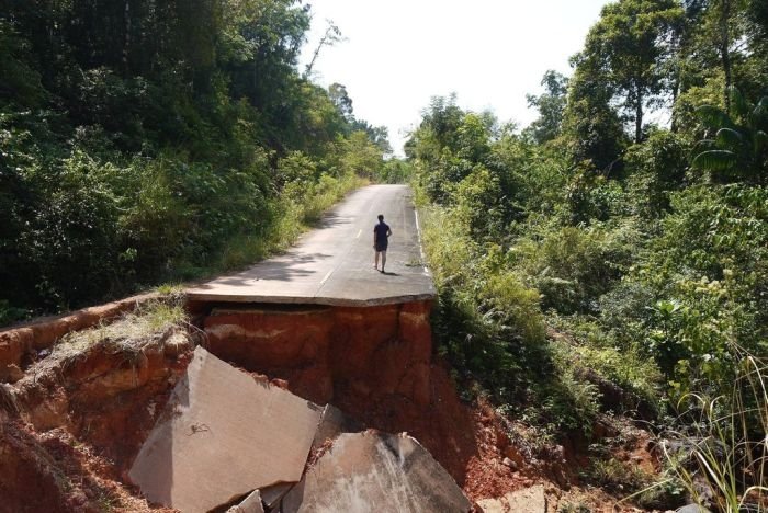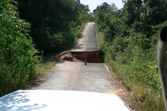 Как гласит это объявление на дороге, которое можно увидеть на острове Чанг, Таиланд: "Будьте осторожны, на этой дороге есть проблема. Она опасна". Предлагаю вам взглянуть на эту "проблемку", которая оказалось не такой уж незаметной... Хотя дорога открыта.