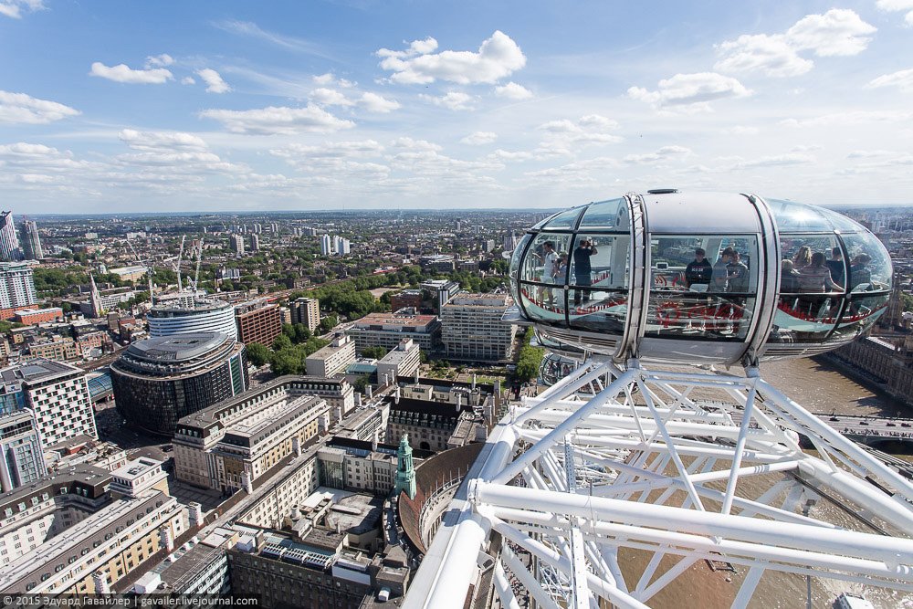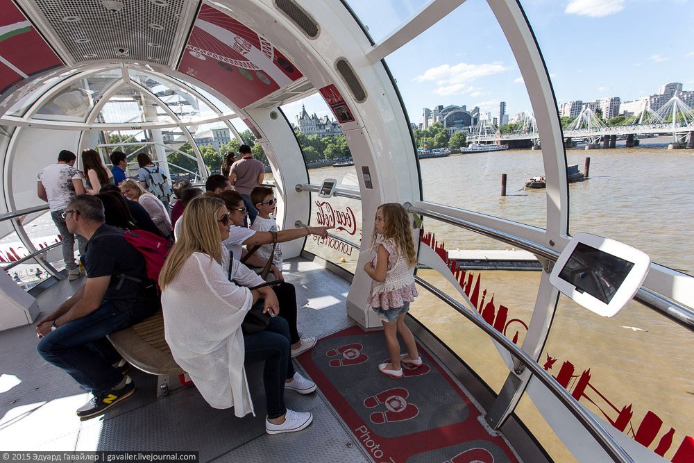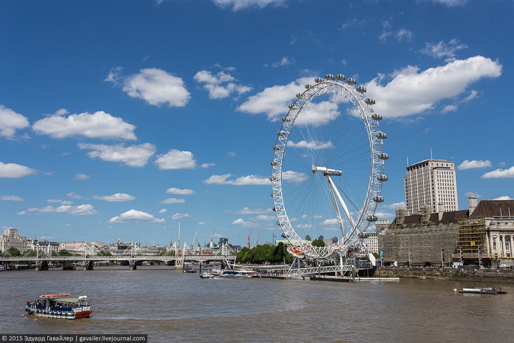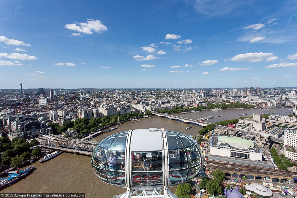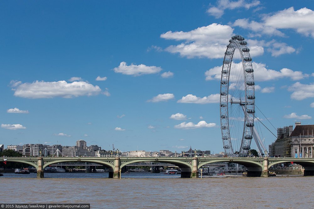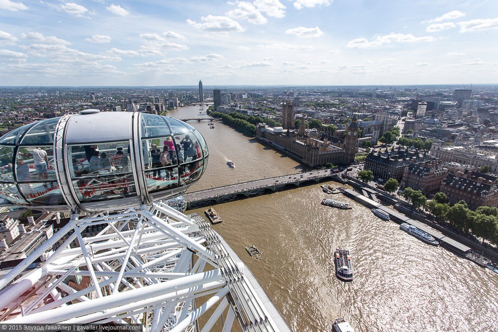Осколок и Глаз – не только причудливые названия, но и самые высотные достопримечательности Лондона. 135-и метровый Лондон Ай (London Eye) оснащен 32-мя закрытыми капсулами, из которых открывается панорамный вид на центр города. Ниже фотографии с колеса и с круизной прогулки по коричнево-бежевой Темзе.