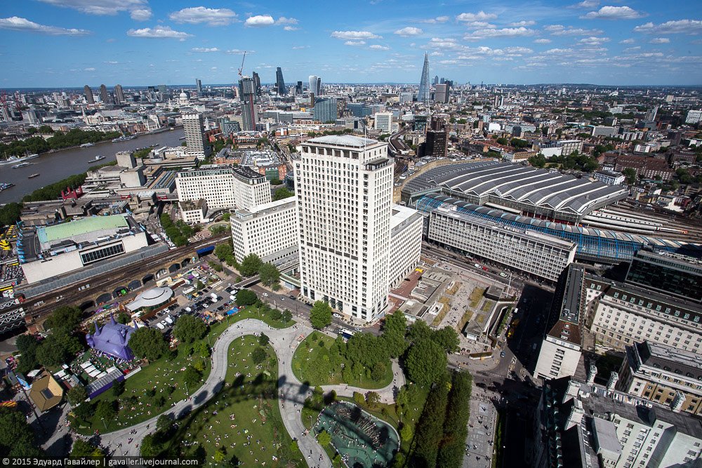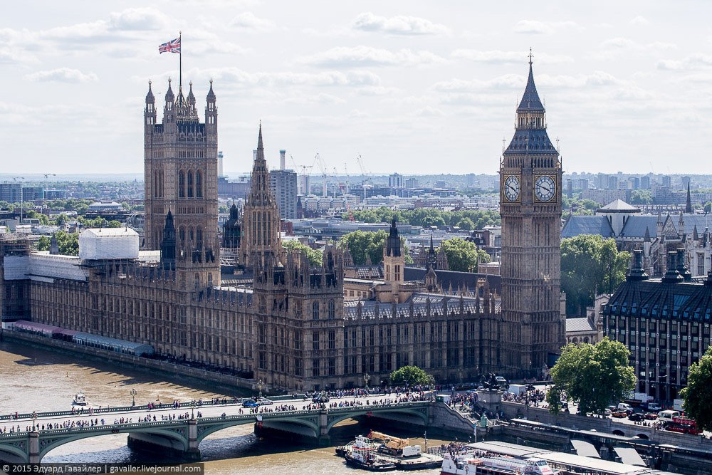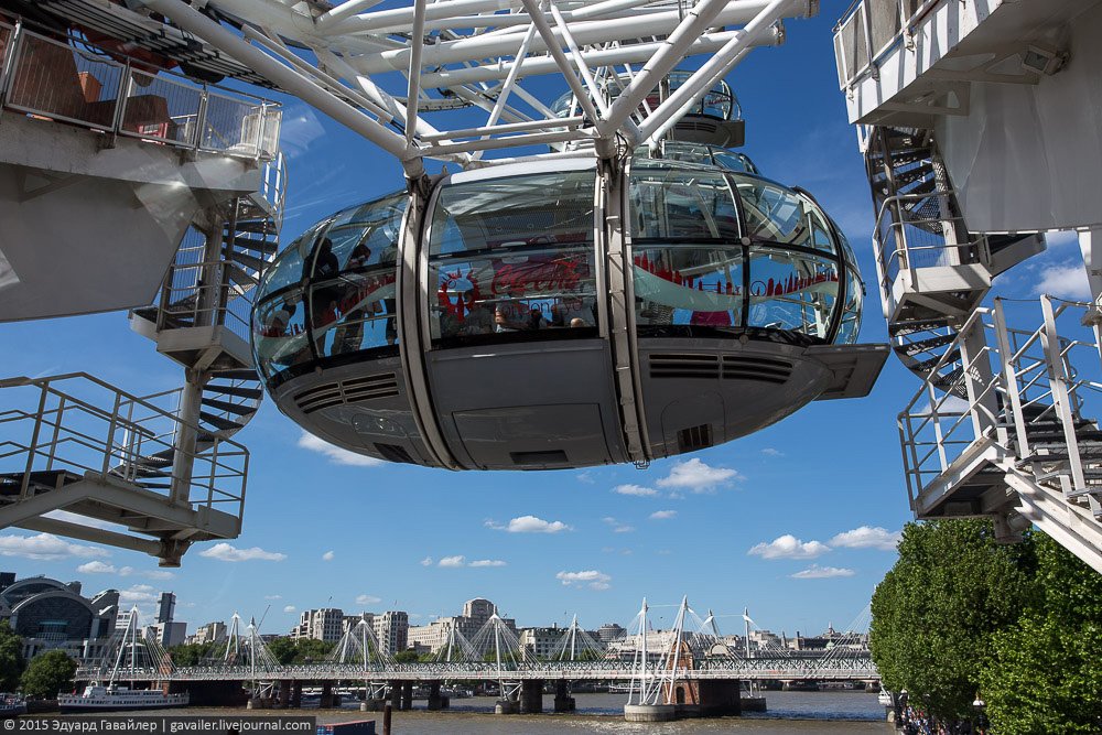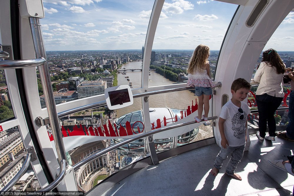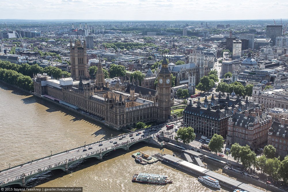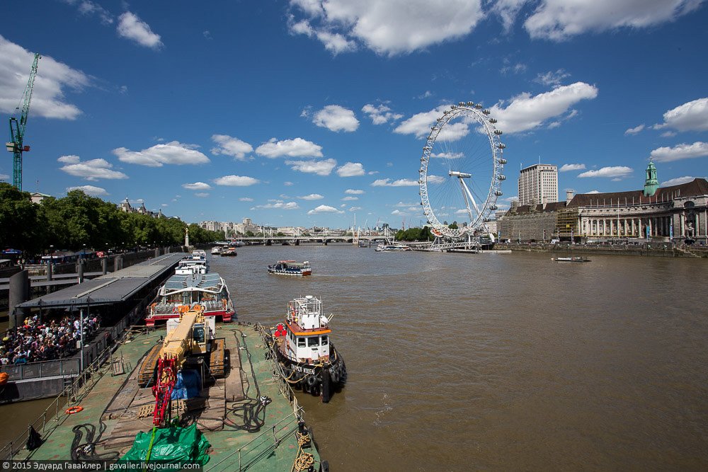 Осколок и Глаз – не только причудливые названия, но и самые высотные достопримечательности Лондона. 135-и метровый Лондон Ай (London Eye) оснащен 32-мя закрытыми капсулами, из которых открывается панорамный вид на центр города. Ниже фотографии с колеса и с круизной прогулки по коричнево-бежевой Темзе.