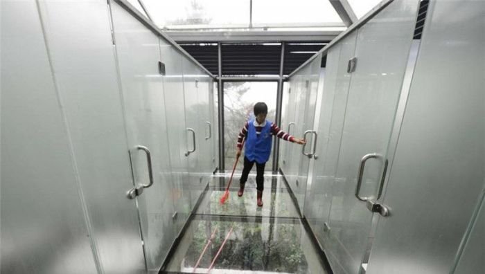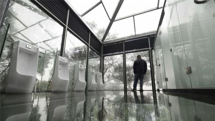 В китайском парке Шияньху, что находится в городе Чанша, провинция Хунань, открыли необычный туалет со стеклянными стенами. Снаружи посетителей туалета со стеклянными стенами разглядеть не так просто, зато внутри каждый может видеть соседа по кабинке. Даже мужские и женские кабинки здесь разделяют полупрозрачные перегородки. Гости парка пользоваться новшеством пока не торопятся.