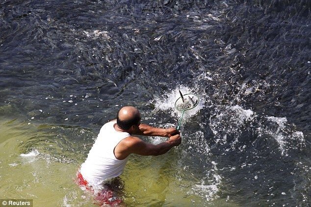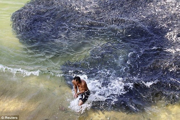 Огромные стаи рыбы появились у берегов Акапулько. Судя по поведению рыба находится в шоковом состоянии. Тысячи сардин, анчоусов и скумбрии сверху выглядят как нефтяное пятно. Ученые считают, что рыбы находятся в таком необычном состоянии из-за землятресения и цунами. Местные рыбаки вылавливают рыбешку буквально голыми руками, зачерпывая ее ведрами.