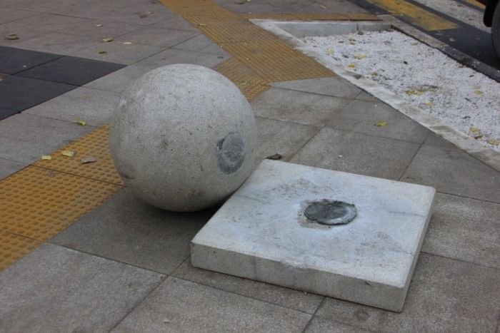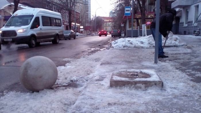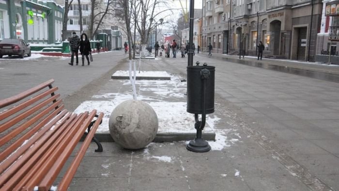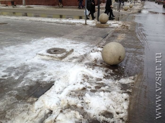 По улицам Саратова вот уже третий месяц катаются 150-килограммовые железобетонные шары, которые были установлены в качестве арт-объектов. В ходе реставрации набережной, шары были установлены для ограничения въезда машин на пешеходную улицу Волжскую. С ноября прошлого года шары семь раз скатывались со своих мест, а помогли им в этом местные жители и автомобилисты. В последний раз, 13 января, бетонная конструкция откатилась на 600 метров от постамента. Каждый раз возвращать шары приходилось с привлечением техники. Власти решили на время убрать шары с улицы и вернуть их только лишь после проведения необходимых укрепительных работ.