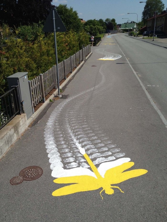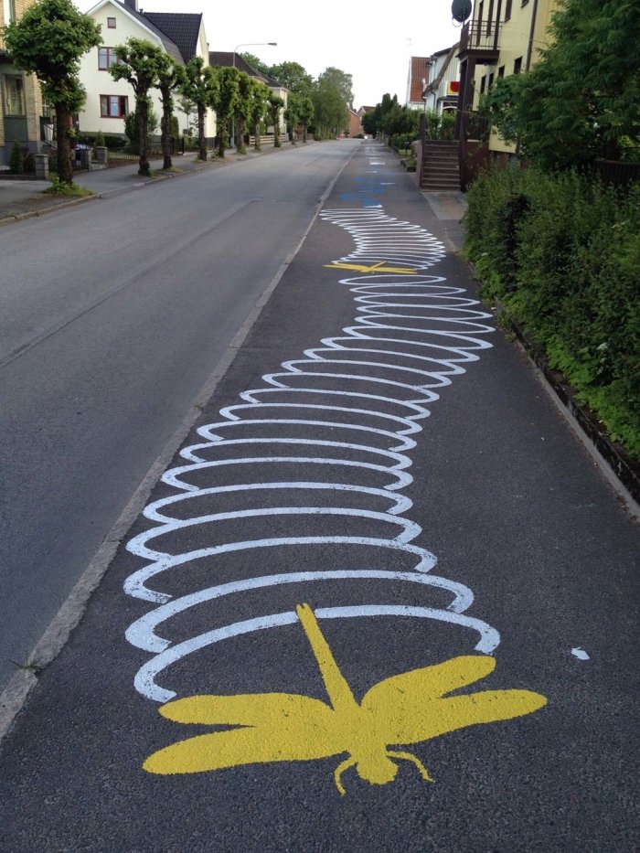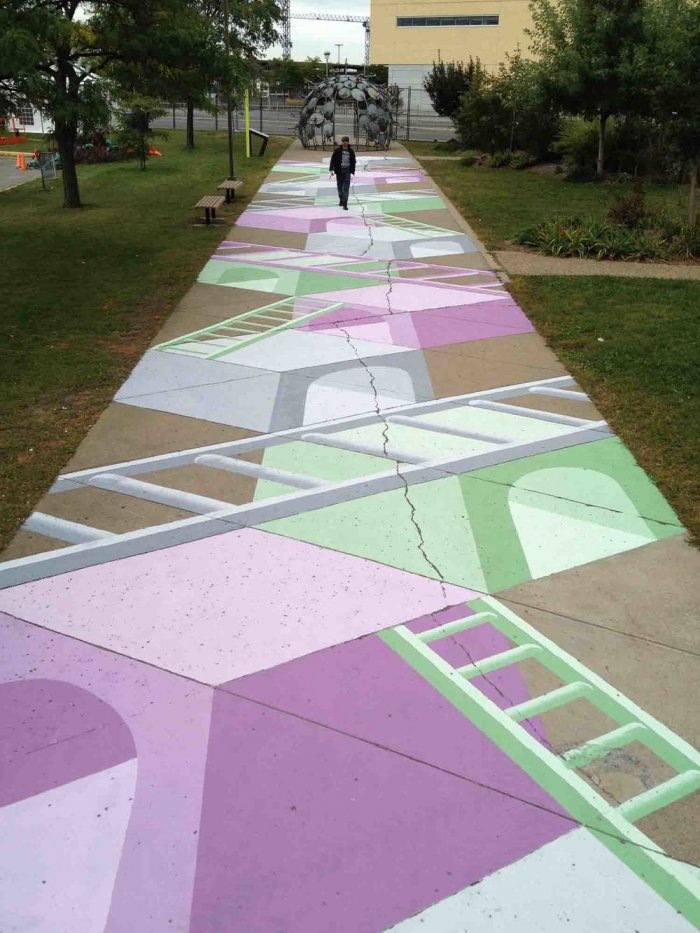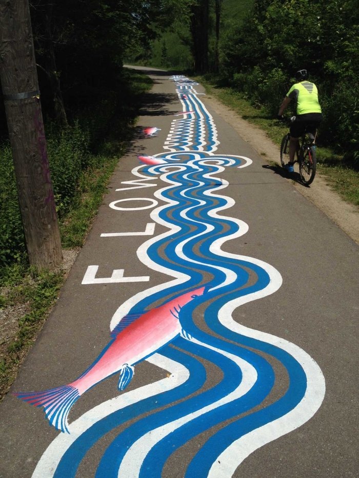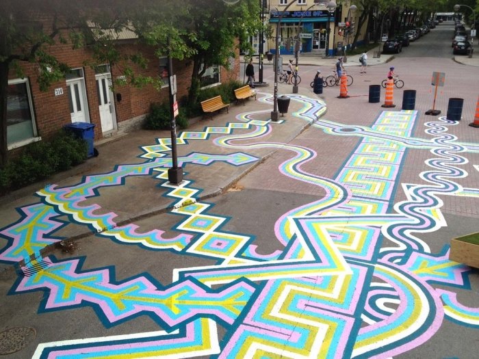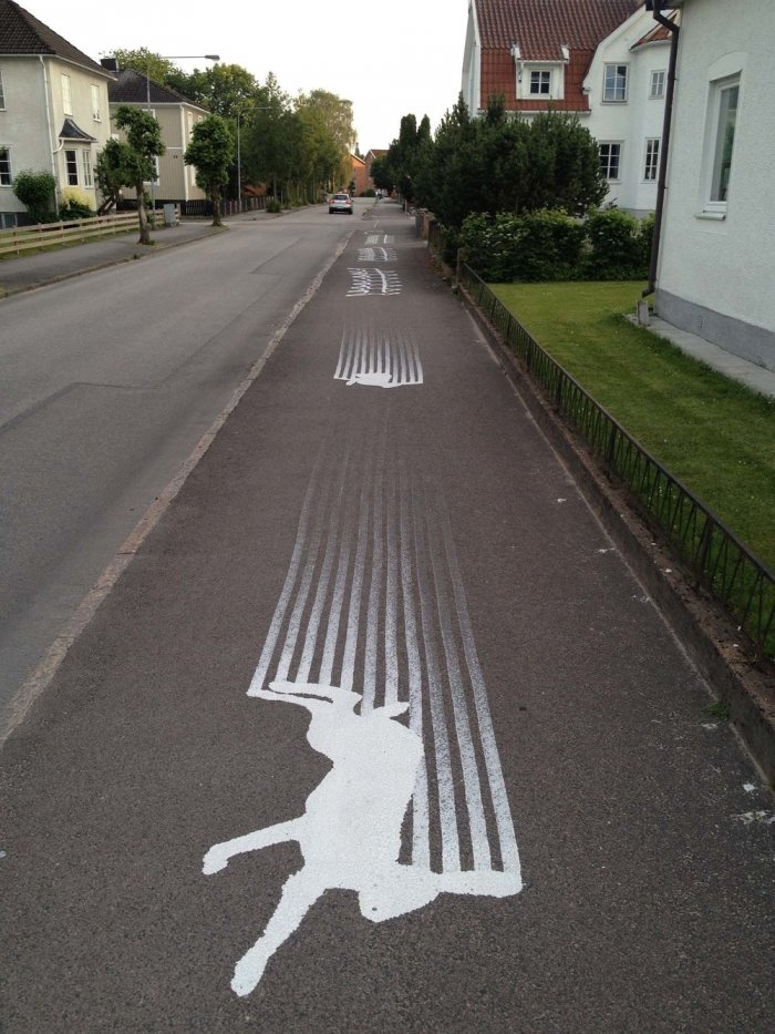 Канадский уличный художник, известный под псевдонимом Roadsworth, оригинально и ловко использует асфальт, как канву для своих произведений уличного искусства. Нередко хорошо различимые только с небольшой высоты или определённого ракурса, его работы затрагивают разные темы, от кризиса с беженцами и современного потребительства до красоты природы.