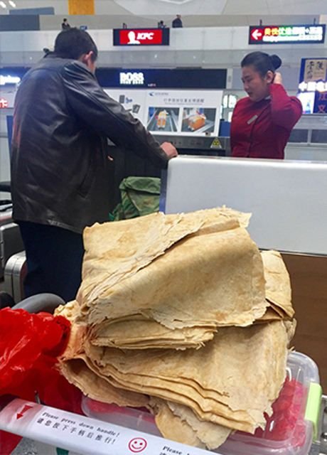 После праздника Весны многие китайцы покидают свои семьи и возвращаются на рабочие места, увозя из дома гостинцы. Одному мужчине заботливая мама приготовила особое угощение - рулон блинов и маринованные овощи, затянувшие на 15 кг лишнего веса. Пассажиру все-таки разрешили пронести "гостинчик" на борт самолета.