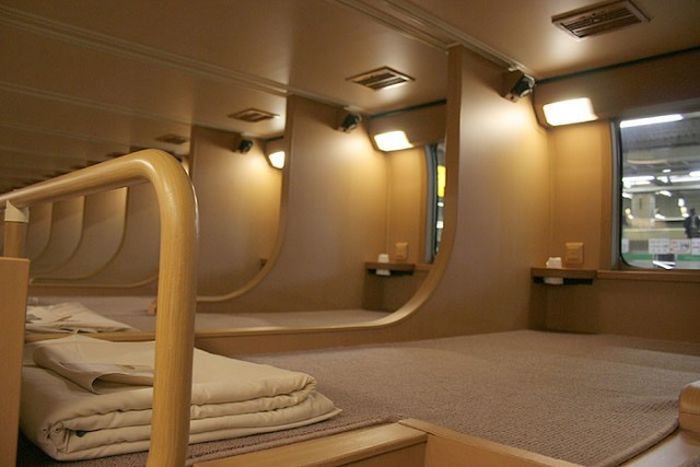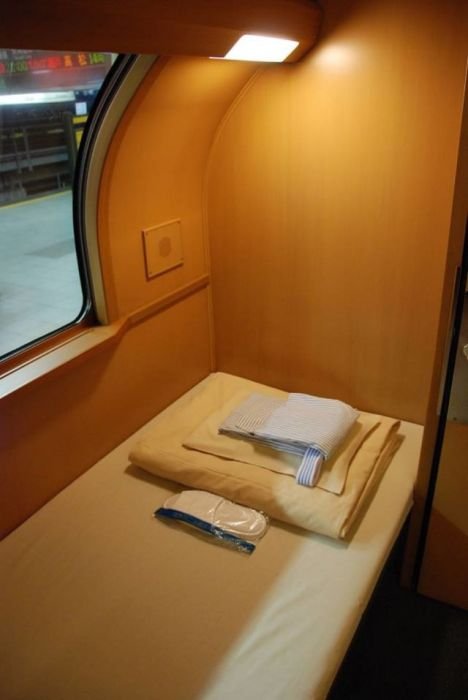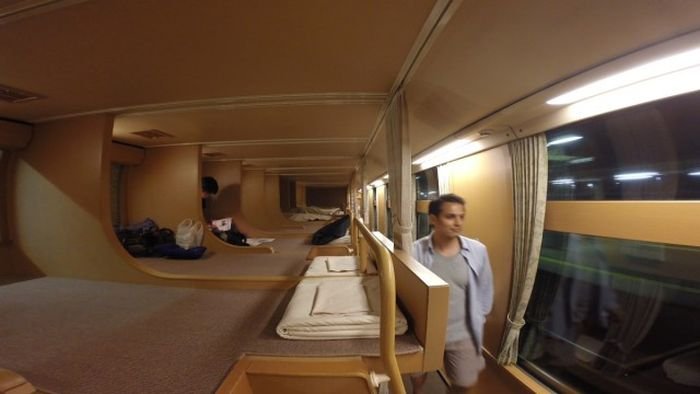 В Японии большой популярностью пользуются ночные экспресс-поезда Sunrise, курсирующие между Токио, Такамацу и Идзумо. Поездку на этом поезде предпочитают авиаперелёту, а все потому, что здесь можно поспать. Так называемые вагоны дзасэки (они же ноби ноби) имеют одиночные секции, разделенные полуперегородками, и ковровое покрытие. Здесь можно сидеть или даже лежать, причем поместиться смогут практически все (длина каждой секции 220 сантимеров). В итоге получается что-то среднее между азиатским капсульным отелем и европейской кушеткой.