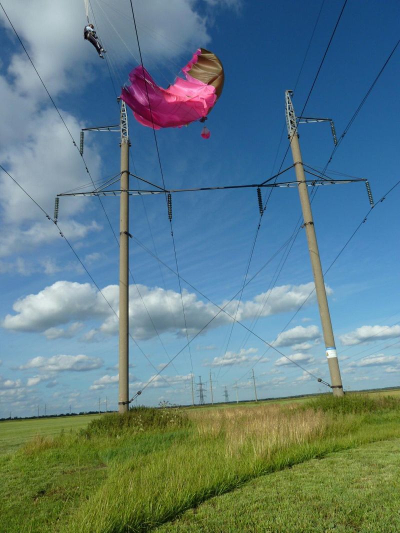 Девушка неудачно прыгнула с парашютом и повисла на проводах ЛЭП. То, что ее не убило током - настоящее чудо. Ей пришлось провисеть около полутора часов, пока сотрудники подстанции не сделали все необходимое, чтобы ее безопасно снять.