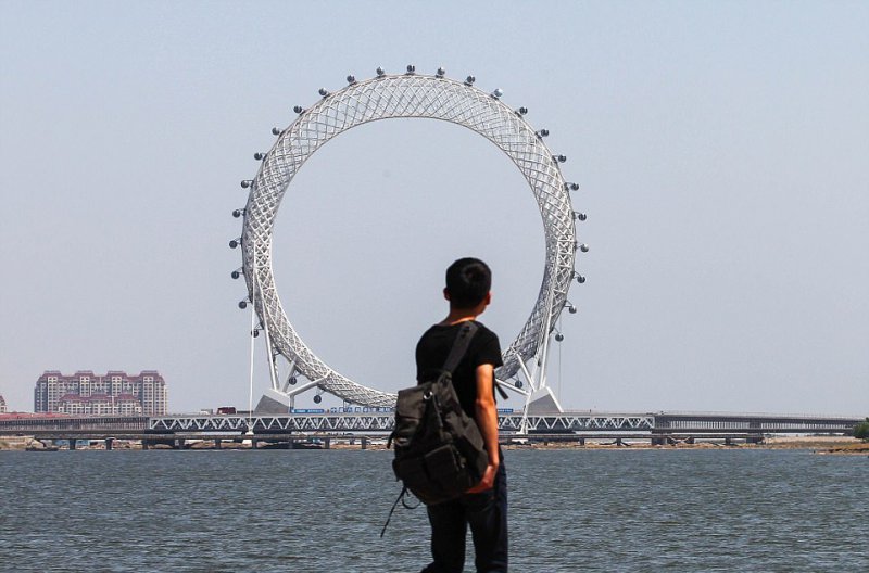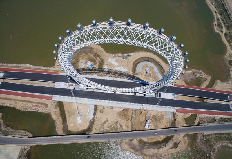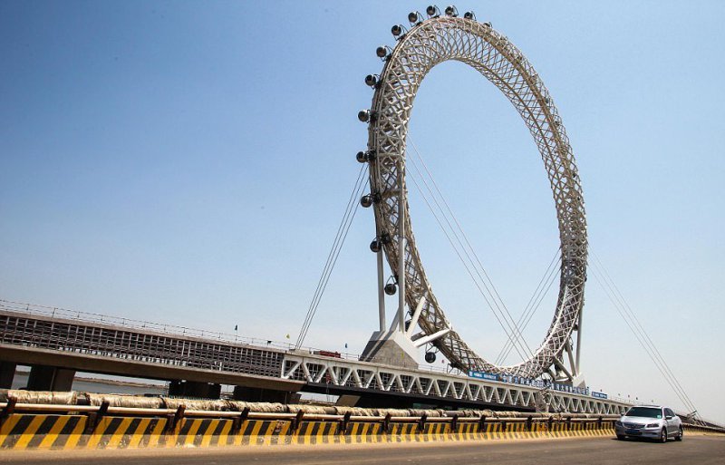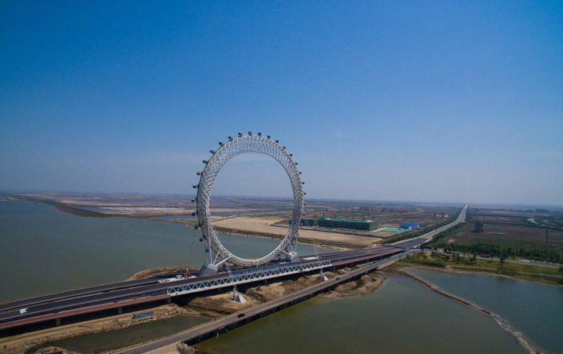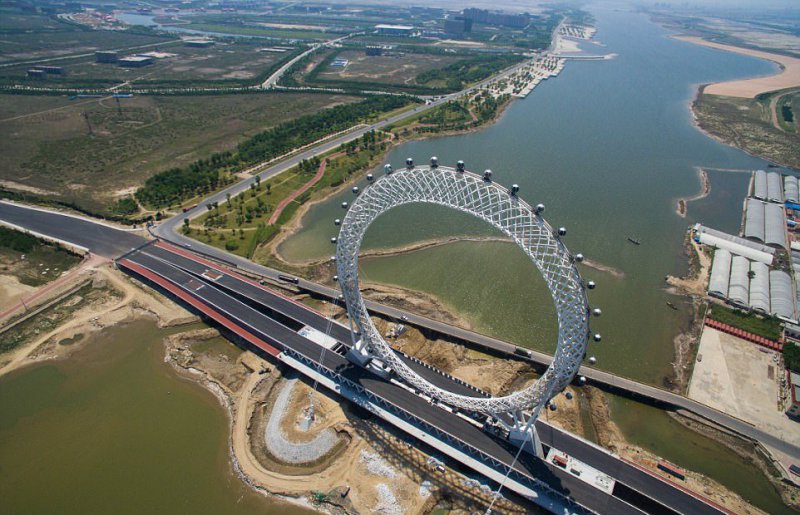 Уникальное безосевое колесо обозрения скоро откроется в городе Вэйфан в провинции Шаньдун, Восточный Китай. Оно построено на мосту через реку Bailang. Диаметр колеса составляет 145 метров, на нем расположено 36 кабинок, каждая вмещает до 10 человек. В кабинках есть телевизор и работает Wi-Fi, для удобства отправлять красивые селфи в социальные сети. На строительство колеса, полный оборот которого составляет ровно 28 минут, ушло 4600 тонн металла.