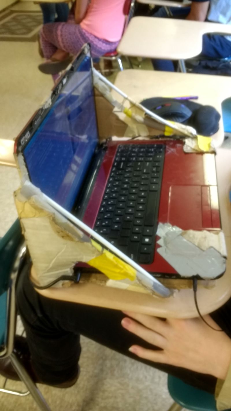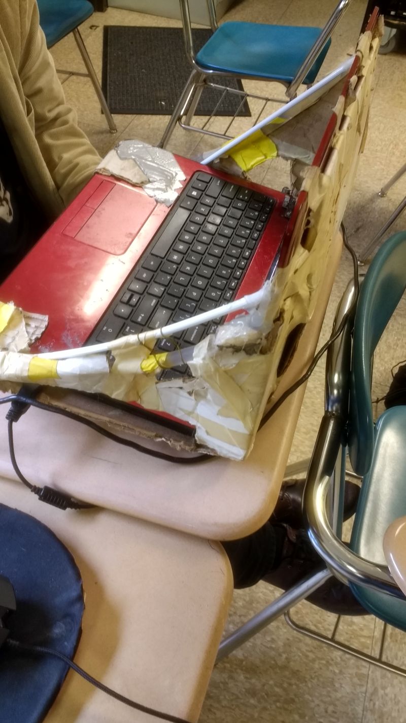 Убитый ноутбук, залатанный картоном, скотчем и трубочками
