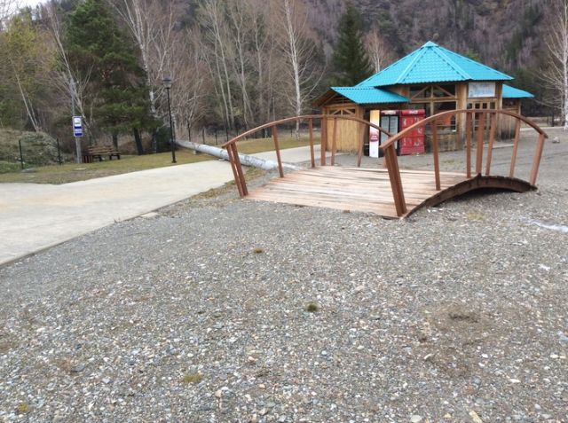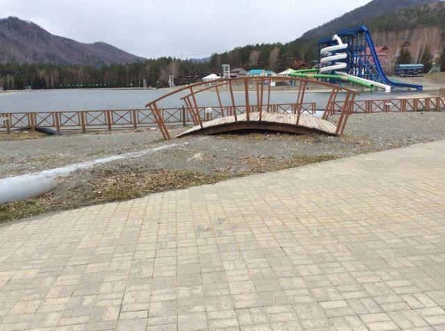 Вот как строители облагородили одно из мест отдыха: бросили трубу около полуметра в диаметре прямо посреди пешеходной дорожки, а мостик, который должны были установить над дорожкой, почему-то оставили рядом с ней.