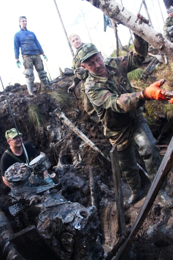 Как выяснилось, самолет не могли извлечь из земли из-за слишком теплых зим, ведь болото и грязь просто не промерзали достаточно, чтобы на место крушения можно было доставить технику. В результате падения тяжелый двигатель ушел в топь на 4,5 метра, но теперь удалось извлечь из-под земли и его. Внутри также были обнаружены останки пилота.