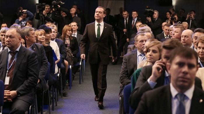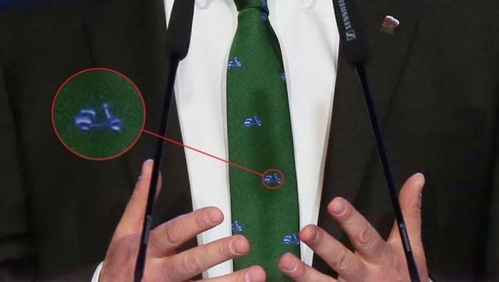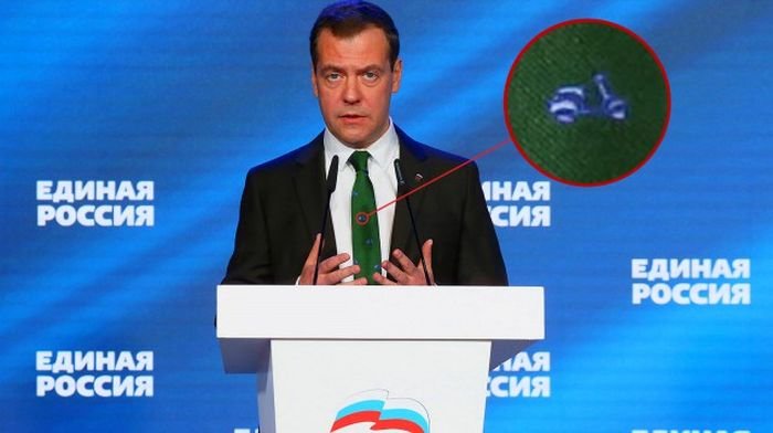 На прошедшем 7 января заседании думской фракции «Единой России» председатель правительства Дмитрий Медведев появился в необычном галстуке, на который тут же обратили внимание СМИ. Ярко-зеленый галстук премьер-министра был украшен голубыми принтами с изображением мопедов. На черном лацкане пиджака Медведева красовался значок партии «Единая Россия».