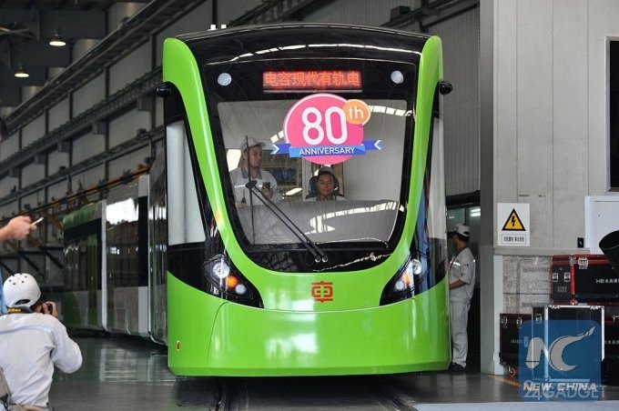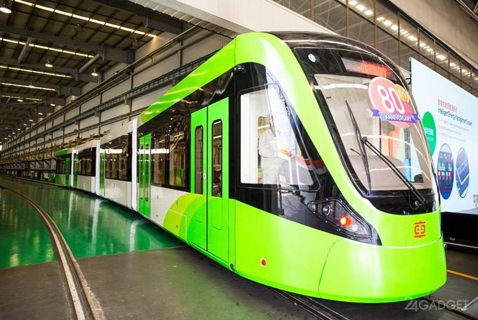 В Китае с производственной линии машиностроительной компании CRRC Zhuzhou Locomotive Co. в городе Чжучжоу провинции Хунань сошел первый трамвай, для передвижения которого не требуются привычные провода.