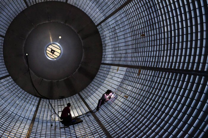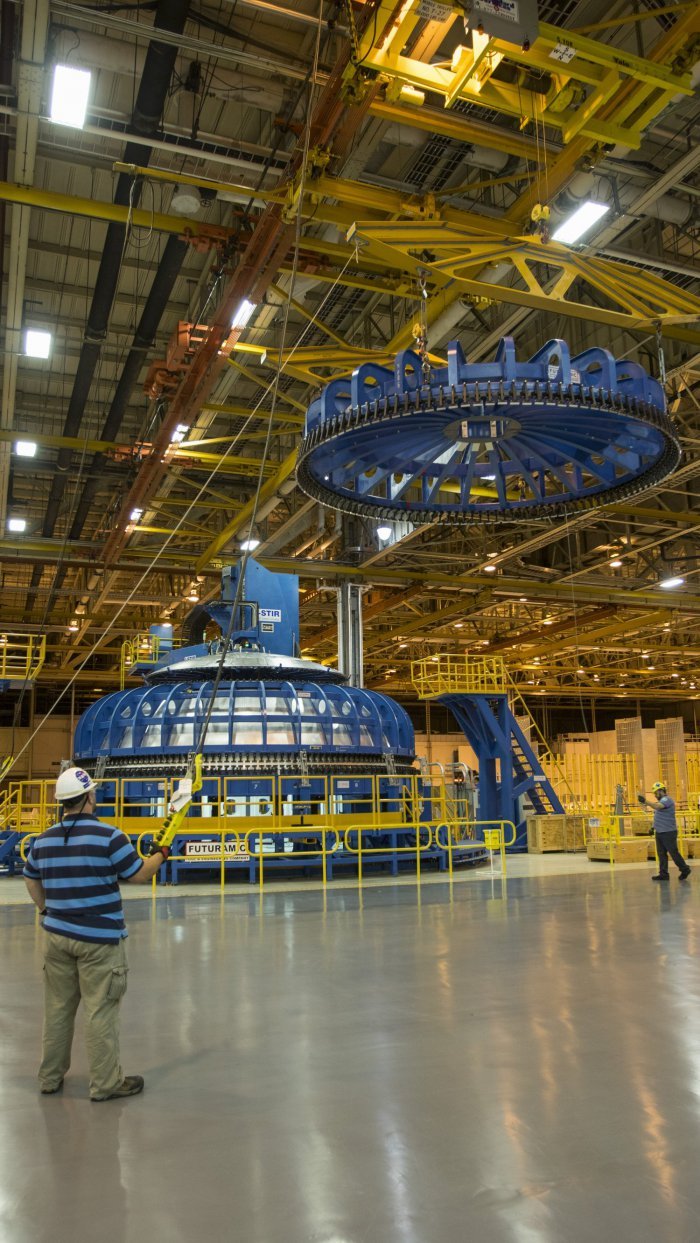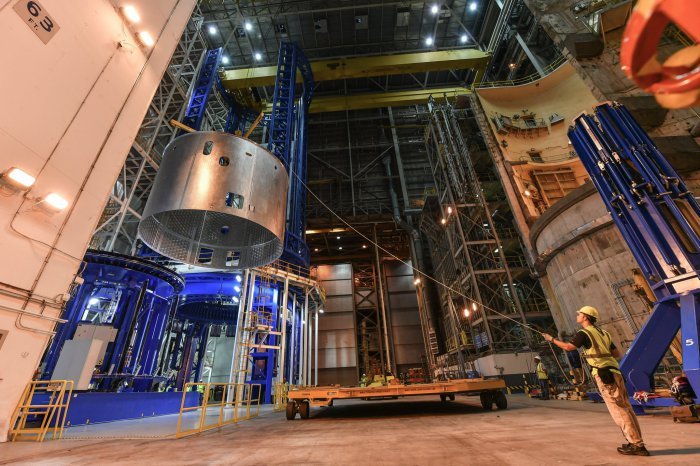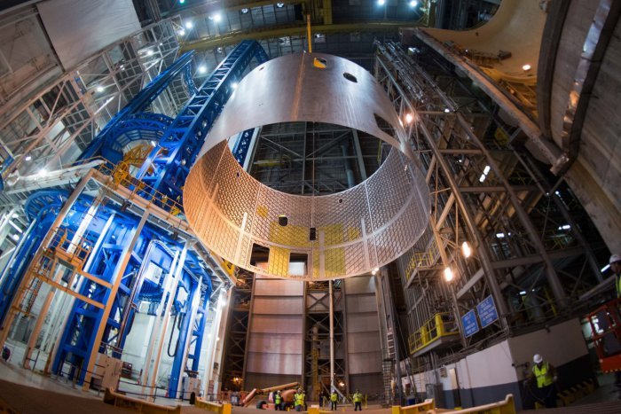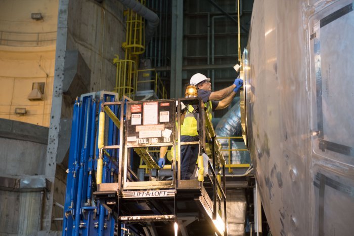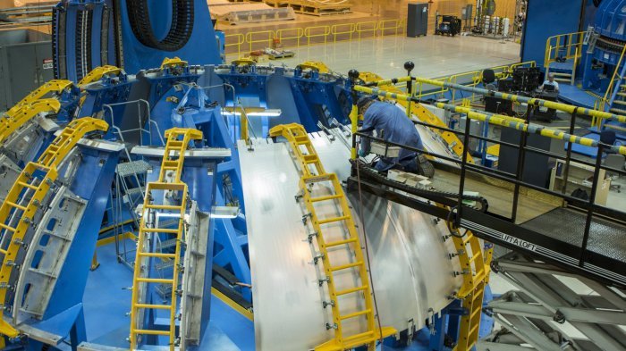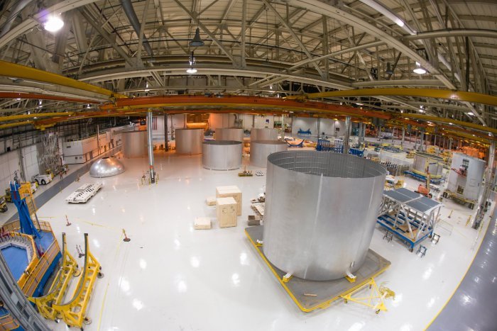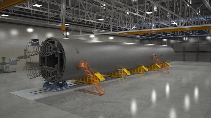 Сборка 40-метрового топливного бака для самой мощной ракеты в истории