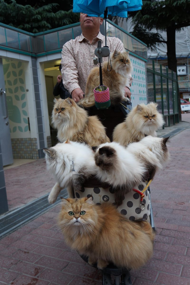 При появлении на улицах Кюсю, Япония, 55-летнего бывшего работника электронной компании, Масахико Суга, многие прохожие обращают на него внимание и начинают фотографировать. Причиной тому - девять кошек, которых японец ежедневно вывозит на прогулку в детской коляске.