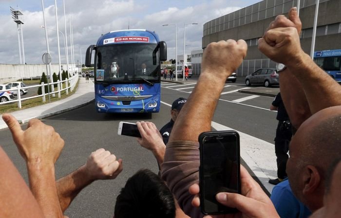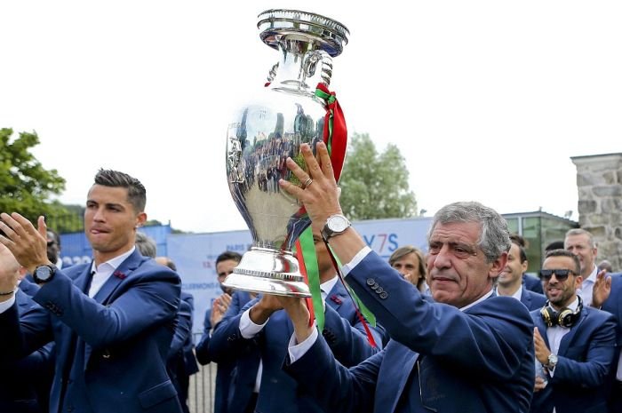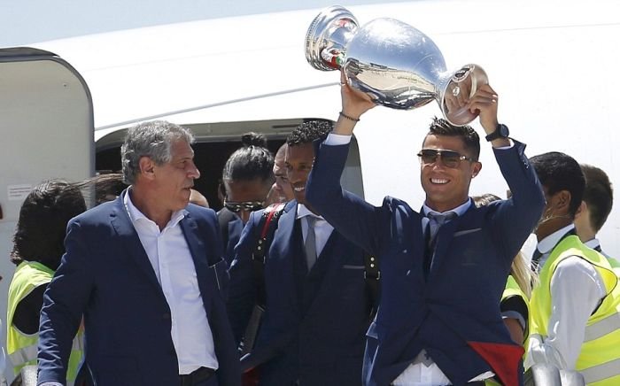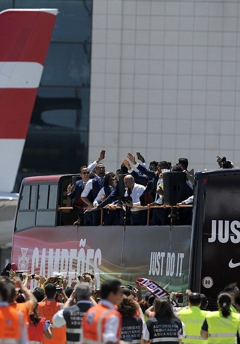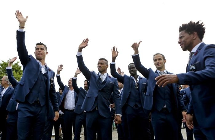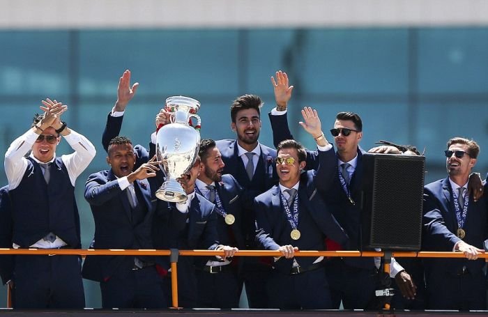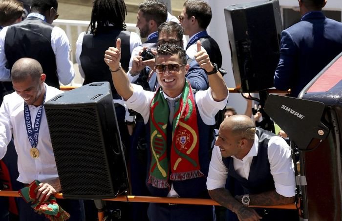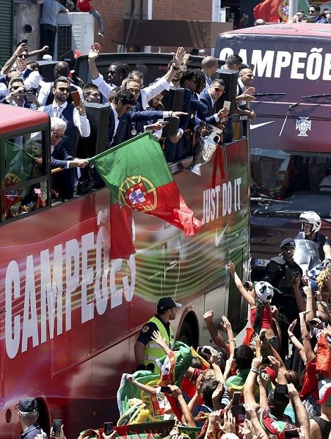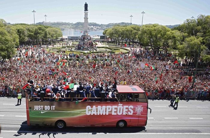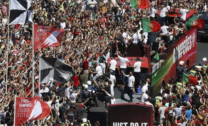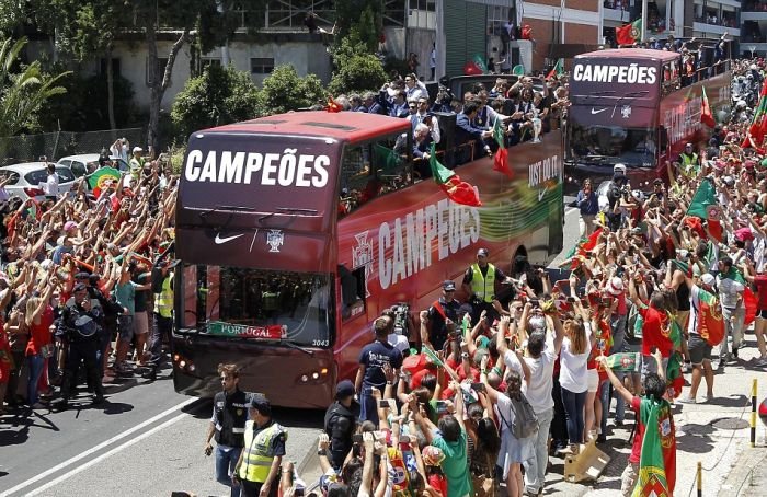 Далее предлагаем взглянуть на то, как встречали чемпионов Европы по футболу в Лиссабоне. В столице Португалии футболистам устроили грандиозный прием с помпезным парадом, на который собрались тысячи болельщиков. Первыми кубок по португальской земле пронесли, вышедшие из самолета Криштиану Роналду и Фернанду Сантуш. На двухэтажном открытом автобусе футболистов провезли по центральным улицам города до дворца президента, где продолжилось чествование победителей.